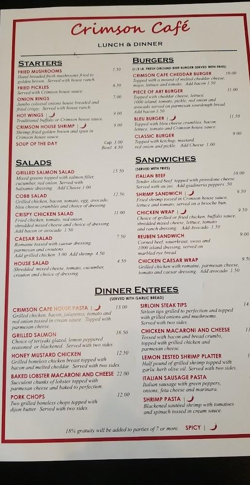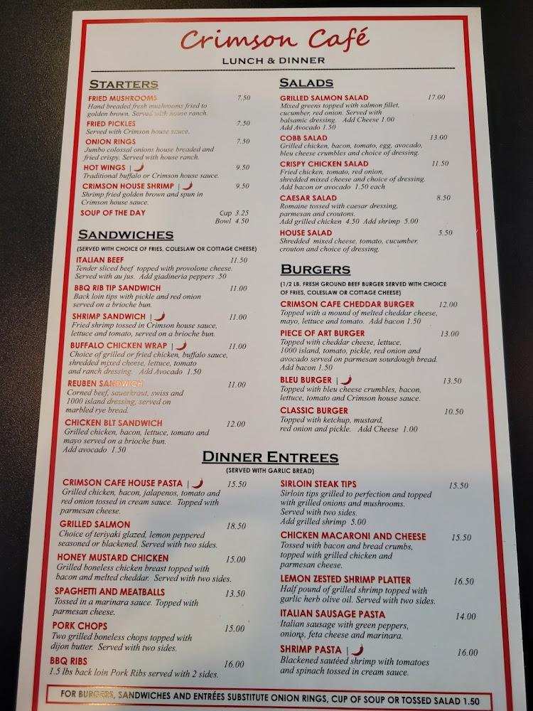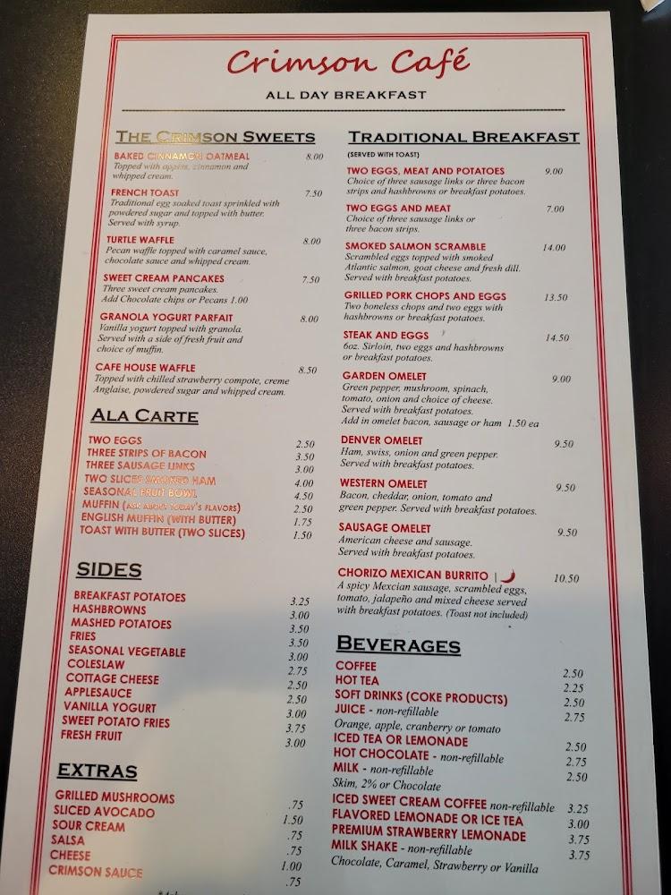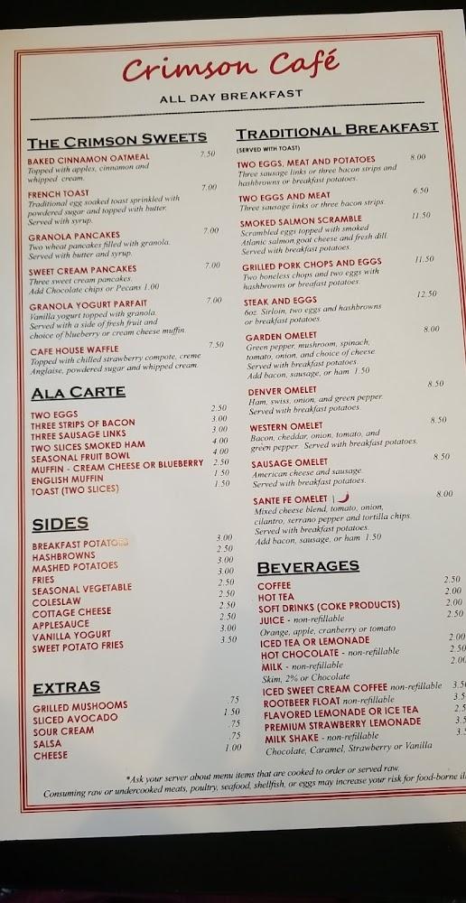 The menu at Crimson Cafe features a variety of hearty American dishes. Breakfast items include classic choices like eggs, bacon, pancakes, and omelets. Their breakfast potatoes are particularly popular, described as flavorful and perfectly cooked.